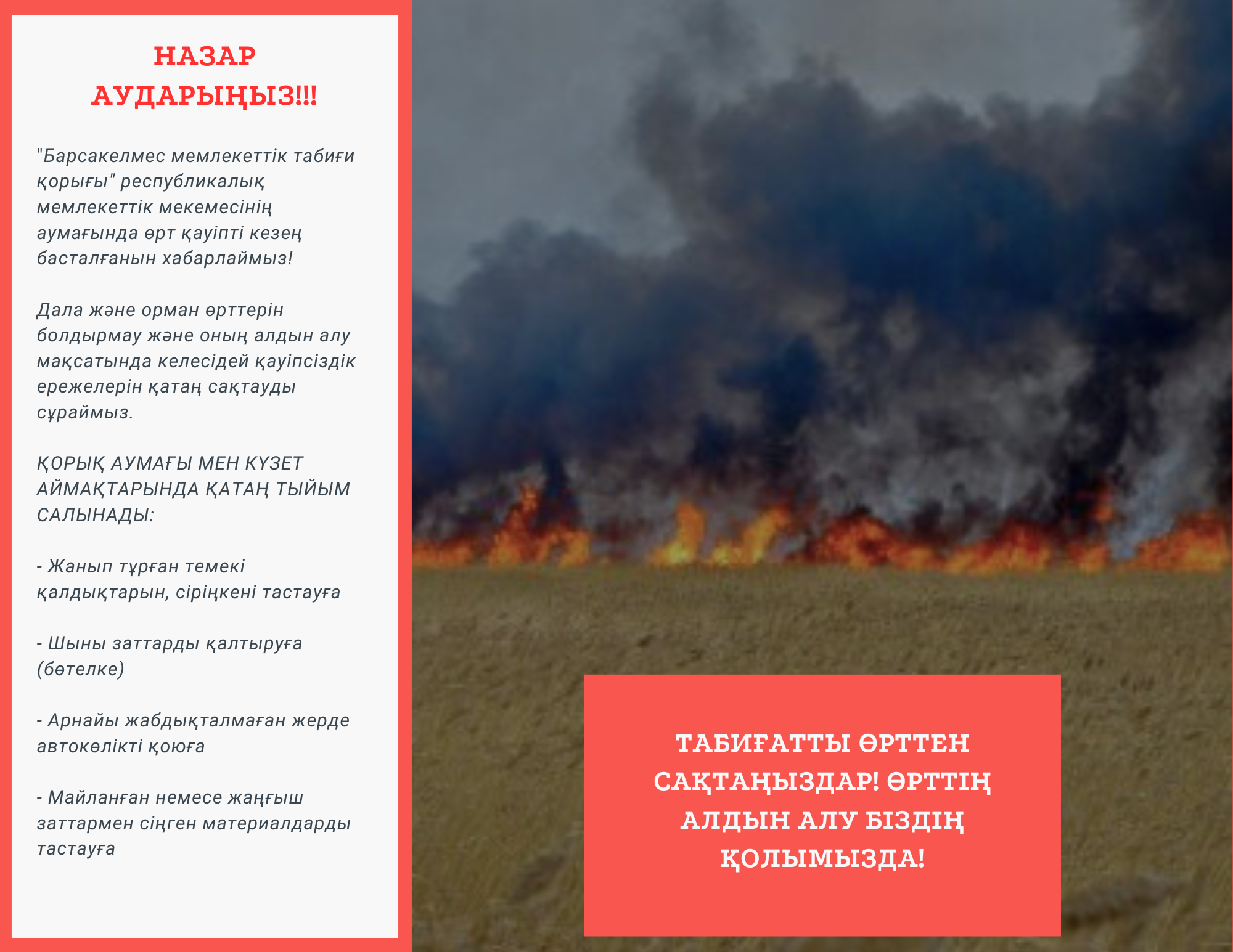 Жоғарыда аталып өткен кез-келген себеп өрттің болу қаупіне себеп болатынын ескере келе қарапайым өрт қауіпсіздігі ережелеріне немқұрайлы қарамай, табиғат аясында өрт қауіпсіздік ережелерін сақтаңыздар.